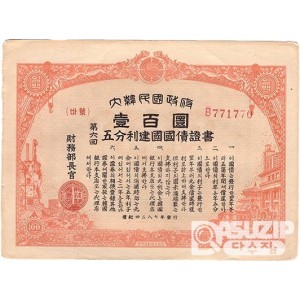 대한민국정부 제6회 오분리건국국채증서 일백원권 입니다.
