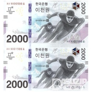 2018년 평창 동계올림픽대회 기념은행권 2000원권 2매 연결권/ AA 9000599 A