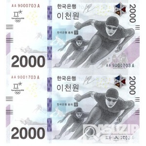 2018년 평창 동계올림픽대회 기념은행권 2000원권 2매 연결권/ AA 9000703 A