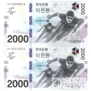 2018년 평창 동계올림픽대회 기념은행권 2000원권 2매 연결권/ AA 9000803 A