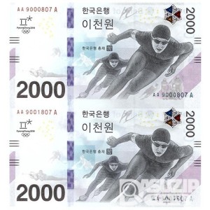 2018년 평창 동계올림픽대회 기념은행권 2000원권 2매 연결권/ AA 9000809 A
