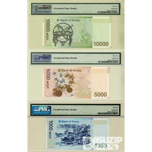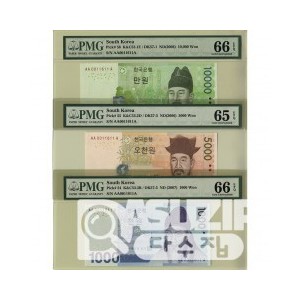 한국은행 바 10000원, 마 5000원, 다 1000원권 AA 0011611 A 초판 세쌍둥이번호세트/ PMG 65,66 EPQ